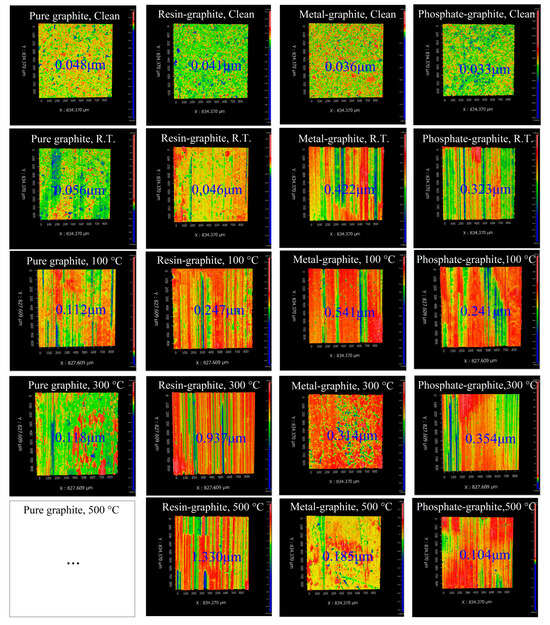 Figure 4 shows the surface morphology, measured using white light interferometry, of different graphite materials under various temperatures conditions. It can be observed that the surface roughness of the graphite materials before the wear test is relatively low, and the surfaces are quite smooth. The roughness values for the four types of clean graphite materials range from 0.033 μm to 0.048 μm. For the pure and the resin-impregnated graphite materials, the surface roughness does not show significant differences compared to the clean samples, and no obvious wear marks are observed on the surfaces of graphite at R.T. However, the surface roughness of the resin-impregnated graphite increases with temperature and reaches 1.330 μm at 500 °C. It can be observed that furrow wear appears on the surface of the resin-impregnated graphite. For the metal-impregnated graphite materials, abrasive wear plays an important role in the wear mechanisms at R.T. and 100 °C, with evidence of noticeable furrow wear on the friction surface. As the temperature increases, the furrow wear becomes unapparent, and meanwhile, the surface roughness decreases, which may indicate a change in the wear mechanisms. There is clear furrow wear on the surface of the phosphate-impregnated graphite materials, ranging from R.T. to 500 °C, and it can be inferred that abrasive wear is the main wear mechanism. Under high-temperature conditions, the tribological performances of the four types of graphite materials exhibit significant differences, which are attributed to the distinct components impregnated within the graphite matrices. Subsequent sections of this paper delve into the thermal and mechanical properties of the graphite materials under high-temperature conditions, aiming to elucidate the disparities in their wear performance.
