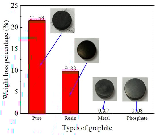 The graphite materials were supposed to work stably for a long period in the application of the seal devices. The prolonged heating tests were carried out for the four types of graphite materials, which were placed in an air atmosphere for 5 h at 500 °C. As shown in Figure 5, the mass loss rates after heating were 21.58%, 9.83%, 0.07%, and 0.08% for the pure, the resin-impregnated, the metal-impregnated, and the phosphate-impregnated graphite, respectively. Many carbon powders were observed off the pure graphite sample, which underwent a destructive change in long-term high-temperature oxidative environments. The resin-impregnated graphite performed better than the pure graphite, while the metal-impregnated and phosphate-impregnated graphite materials showed minimal changes. In conclusion, the oxidation resistance of the four graphite materials under high-temperature conditions can be ranked as metal-impregnated ≈ phosphate-impregnated ≫ resin-impregnated > pure graphite.