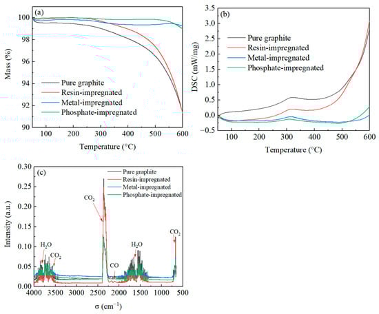 To investigate the mass loss mechanisms of the four graphite materials in the heating tests, Thermogravimetric Fourier Transform Infrared Spectroscopy (TG-FTIR) analysis was performed on the graphite samples in an oxidative atmosphere. Figure 6a illustrates the change in the graphite mass as the ambient temperature is increased from R.T. to 600 °C at a heating rate of 10 °C/min. It is observed that the pure graphite material loses mass at first, with the most pronounced mass loss (nearly 9%) at 600 °C among the four graphite materials. The resin-impregnated graphite remains nearly stable below about 250 °C, while the mass loss per minute increases rapidly at a temperature over 250 °C. And then, the mass loss of the resin-impregnated graphite reaches a value comparable to that of the pure graphite at 600 °C, which indicates a complete failure of the resin’s protective effect. The masses of the metal-and phosphate-impregnated graphite materials remain almost stable under about 550 °C and show a slight decrease in the range of 550 °C to 600 °C, which supports the application of these two graphite materials under high temperatures.