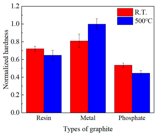 To further evaluate the overall performance of the impregnated graphite materials under high-temperature conditions, the hardness of the resin-impregnated, metal-impregnated, and phosphate-impregnated graphite materials was measured at R.T. and 500 °C. The results are shown in Figure 7. To elucidate the hardness results more clearly, the normalized hardness is defined as the ratio of the measured hardness of the graphite material and the maximum of all measured hardness data. It can be observed that the hardness of both the resin- and phosphate-impregnated graphite materials decreased at 500 °C compared with R.T., while the hardness of the metal-impregnated graphite increased in the same situation. This phenomenon will be clarified in Section 3.3, referring to the SEM results.