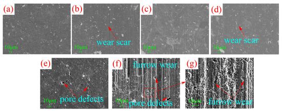 Figure 8a,b show the SEM images of the pure graphite before and after the friction tests at R.T. The dark areas are carbon, which occupy the majority of the image. The little spots are the aggregation of small amounts of impurities. It can be observed that the surface of the worn pure graphite is relatively smooth with a few wear scars. Under high-temperature conditions, prolonged oxidation can lead to significant structural degradation in the pure graphite, rendering the surface of the graphite less dense and more friable. This deterioration makes it challenging to perform friction and SEM tests for the pure material. Thus, the observations were limited to the wear results at R.T. for the graphite material. Figure 8c–g present the SEM images of the resin-impregnated graphite before and after the friction tests at R.T. and 500 °C. After the friction test at R.T., the surface of the resin-impregnated graphite remains relatively smooth with only a few wear scars. After oxidation in high-temperature environments, the surface of the resin-impregnated graphite at 500 °C is as shown in Figure 8e. It can be observed that there are some pore defects on the surface of the graphite materials. It can be inferred from Figure 6 that the thermal stability of the resin-impregnated graphite deteriorates and the resin undergoes decomposition at 500 °C. This phenomenon leads to the formation of these pore defects, which further accelerate the oxidative degradation and reduces the wear resistance of the graphite matrices. During the test, a large amount of obvious furrow wear appear on the friction areas of the resin-impregnated graphite. Further magnified observation reveals that chunks of the resin and graphite have detached from the worn areas of the material. The degradation of the resin decreases the strength of the graphite regions that were previously filled with the impregnations, making the graphite more prone to fragmentation. These fragments become the abrasive particles that enter the friction interface, thereby exacerbating the wear on the graphite surface.