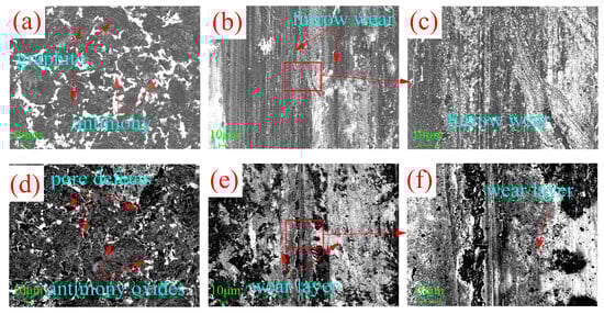 For the metal-impregnated graphite materials, the metal phases are distributed as clumps or even network structures in the graphite matrices before friction tests, as shown in Figure 9a. During the test, the surface of the metal-impregnated graphite undergoes friction, and exhibits furrow wear at R.T. (Figure 9b,c), which is consistent with the measured results of the white light interferometry. At 500 °C, the unworn areas of the graphite surface are as shown in Figure 9d. It can be observed that the oxidation of the graphite matrix results in the formation of some pore defects. The metal phase has been oxidized to form antimony oxides, yet the network structures are retained, which increases the hardness of the metal-impregnated graphite at 500 °C compared with R.T. Meanwhile, although several parts of the surface layer of the graphite matrices are oxidized and some pore defects are formed at 500 °C, the oxidation of antimony metal itself and the formation of the antimony network prevent further oxidation of the graphite matrices, protecting the deeper layer of graphite matrices, and enhancing the high-temperature stability and wear resistance of the metal-impregnated graphite. These further corroborate the results shown in Figure 6 and Figure 3, respectively. During the friction test, the friction mechanisms changed, and no distinguished furrow wear was observed, and simultaneously a wear layer of the antimony oxides was formed on the surface of the graphite material, as shown in Figure 9e,f, which may decrease the roughness of the graphite surface. Meanwhile, this wear layer may further reduce the wear rates of the metal-impregnated graphite compared with other impregnated graphite materials.