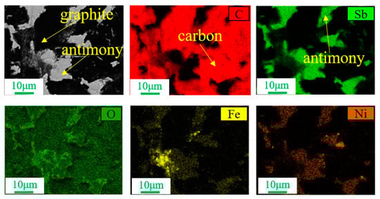 Element distribution of the unworn area of metal impregnated graphite materials at 500 °C: C (red), Sb (light green), O (dark green), Fe (light yellow), Ni (orange).