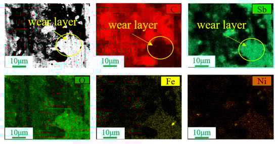 Figure 10 presents the EDS results of the clean metal-impregnated graphite material at R.T. In the EDS elemental distribution images, each element is represented by a distinct color, with the brighter areas indicating a higher concentration of the element at that location. It is observable that the carbon matrices and the main impregnated metal, Sb, exhibit a mutually exclusive distribution across the graphite surface. The oxygen is ubiquitously distributed across the surface of the graphite material, with relative enrichment observed in the regions containing the Sb element. After the wear test at 500 °C, a distinct wear layer forms on the metal-impregnated graphite surface, as shown in Figure 11. The C and Sb elements are both distributed within this wear layer, with a sparser pattern for C and a concentrated pattern for Sb. The reason for the sparser pattern of C is probably that the graphite matrices were worn during the friction tests and some C elements were mixed in the wear layer. The bright regions for O coincide with those for Sb in the wear layer, suggesting that Sb was oxidized and formed an oxide wear layer that protected the carbon matrices and mitigated the oxidation rates of the graphite. Thus, the excellent thermal stability and the formation of a hard wear layer together result in the smallest wear rates of the metal-impregnated graphite at 500 °C compared with other impregnated graphite, as shown in Figure 3.