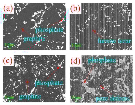 For the phosphate-impregnated graphite materials, phosphates are relatively uniformly distributed throughout the graphite matrices, as shown in Figure 12a. During the wear tests, the graphite sustains minor destruction at R.T., with most of the phosphates still embedded in the graphite matrices. The abrasion of the graphite material’s surface is intensified by the detachment of the phosphates, with Figure 12b demonstrating that abrasive wear is the primary mode of graphite material loss. As shown in Figure 12c, the clean graphite surface maintains a relatively smooth state at 500 °C, with no apparent pores, which suggests that the graphite material impregnated with the phosphates exhibits superior oxidative resistance properties. Simultaneously, as corroborated by Figure 6, the graphite impregnated with phosphates exhibits outstanding thermal stability at 500 °C. As illustrated in Figure 12d, there are some aggregations of the phosphates and few pore defects in the wear areas. During the friction test at 500 °C, the surface of graphite material suffers wear and oxidation, leading to more phosphates being exposed. These phosphates may undergo fragmentation, detachment, and migration, accumulating in the wear regions [32]. To some extent, this accumulation can affect the stability of the friction coefficient, and even exacerbate wear during the test.