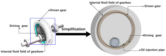 High-speed gears are widely used in vehicles, aircrafts, and other essential areas because of their high transmission accuracy, consistent transmission ratio, smooth transmission, and high efficiency [1]. Oil injection lubrication, being one of the primary lubrication systems for high-speed gears, has an impact on gear life and transmission efficiency. However, due to the high speed of high-speed gears, their complex operating circumstances and injection pipe settings are primarily determined through experience and other factors, resulting in poor high-speed gear lubrication, vibration or damage in bearings and other components, and even major accidents [2,3,4]. Many researchers have investigated or applied computational fluid dynamics (CFD) methodologies to problems such as gear injection lubrication in order to reduce computational time and cost.