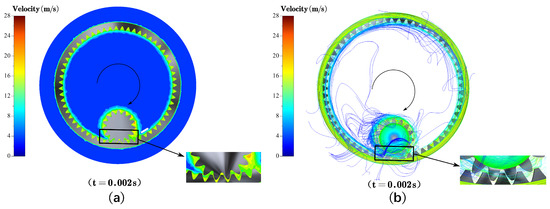 Diagram of the airflow resistance characteristics near the gear during its motion. ((a) Contour figure of air velocity under gear rotation; (b) diagram of air velocity trace under gear rotation).