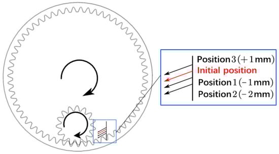 The impact of position factors on internal gear lubrication was investigated by adjusting the longitudinal position of the oil injection port based on its initial position. A maximum of three places were developed, with a 1 mm spacing betwee then injection positions, for which a schematic diagram is presented in Figure 7. This section examines the injection trajectory in the gear box’s cross-section, the distribution of oil on the gear and ring gear, and the average oil volume fraction under various injection parameters to demonstrate the effect of injection position parameters on internal meshing gear lubrication.