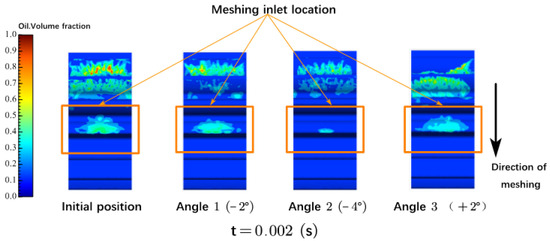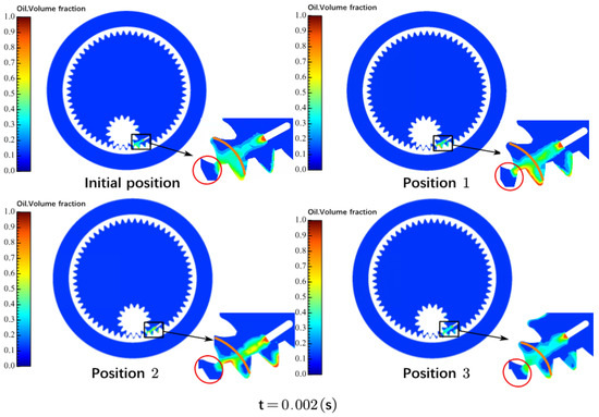 Distribution of the gear-lubricating fluid in four different position parameters (the orange region represents the meshing intake area).