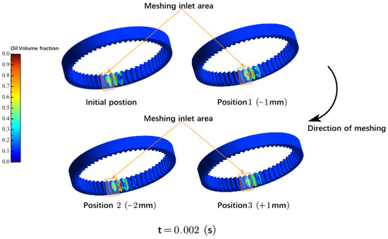 Figure 8 presents a cross-sectional view of the gearbox, showing the trajectory and distribution of the lubricant at 0.002 s as it is injected into the gears. It is possible to assess the influence of nozzle location on the lubrication performance of the gear system by monitoring the lubricant’s route and volume fraction fluctuations (with brighter colors indicating greater lubricant concentrations). When comparing Position 1 to the initial position, the overall lubricant volume fraction in Position 1 during injection into the meshing zone is noticeably brighter and higher lubricant at the meshing entry. Position 2 has the brightest color for the oil volume fraction along the path from oil injection to the meshing zone. However, Position 2 is too close to the ring gear, causing a high oil volume distribution in other parts of the gear meshing zone. The overall oil volume percentage of the oil path at position 3 is lower than that at the initial position. It is worth noting that the oil distribution in the red area at position 3 is wider than that in the initial position and position 2. However, position 3 has a deeper color for the total oil volume proportion in the red zone than position 1.
