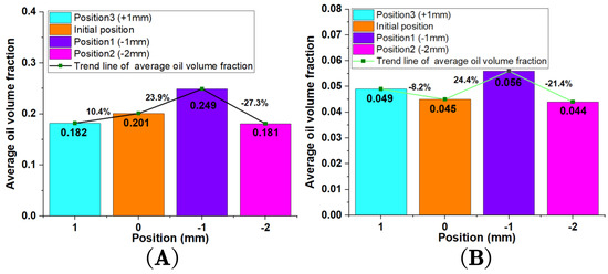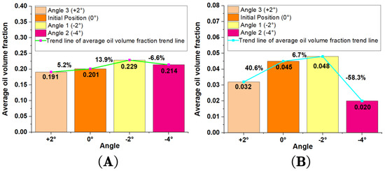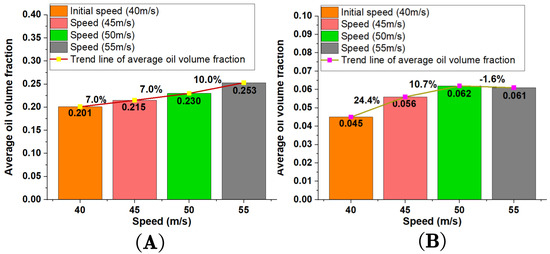 The average oil volume fraction in the meshing area: (Figure (A) depicts the average oil volume fraction on the gear surfaces in the orange area; Figure (B) depicts the average oil volume fraction on the gear surfaces in the red area).