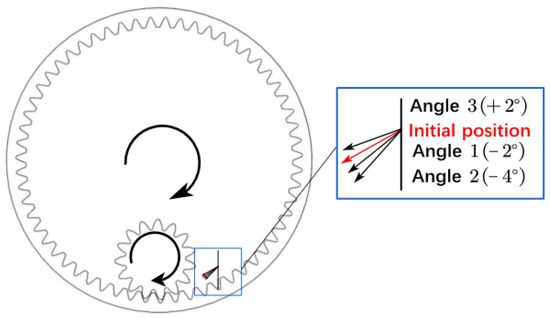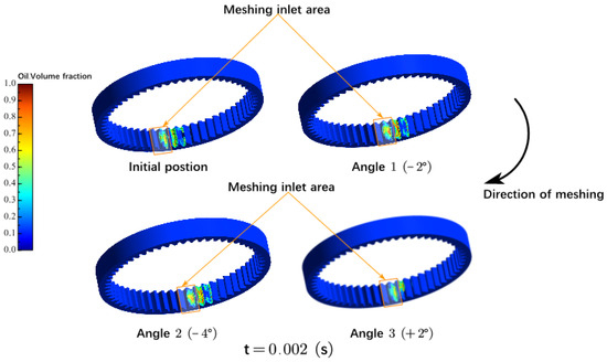 The influence of the angle factor on the lubrication of the internal gear is examined by modifying the angle of the oil injection port based on the initial position, and the maximum three angle settings are produced, each angle is 2° apart. The schematic diagram is depicted in Figure 12. This part investigates the injection trajectory in the gear box’s cross section, the oil distribution on the gear and ring gear, and the average oil volume fraction under different injection parameters to show how injection angle parameters affect internal meshing gear lubrication.