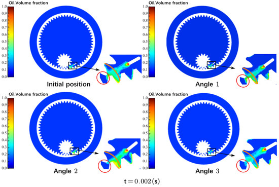 By analyzing Figure 15, it can be observed that as the angle shifts toward the ring gear, the color distribution of the oil on the ring gear becomes brighter, and the oil distribution across other parts of the ring gear at the meshing area becomes more extensive. However, at Angle 2, the oil distribution across the other areas of the ring gear is the most widespread. The oil distribution and total oil volume percentage in Angle 2’s ring gear meshing area are less than those in Angle 1 due to the oil’s gravity and the oil injection port’s proximity to the ring gear.