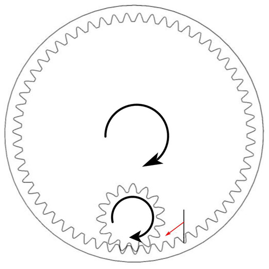 Schematic diagram of the influence of injection position parameters on the lubrication of the internal meshing gear (each arrow indicates the center line of the oil injection port, with the red arrow representing the center line of the oil injection port’s initial location).