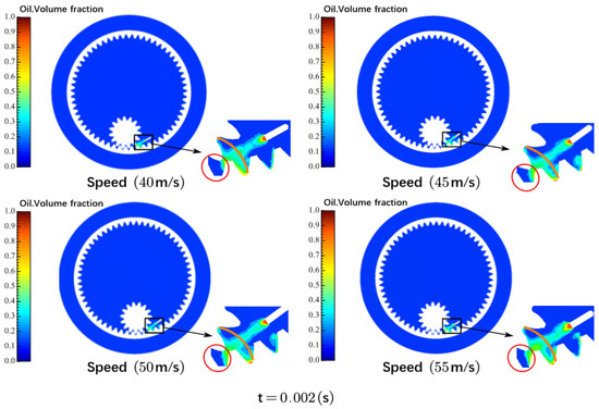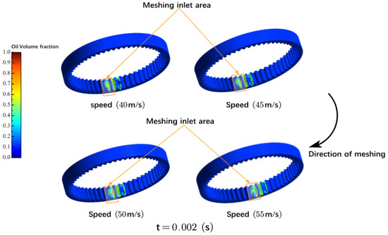 When different oil injection speeds are compared, it is discovered that as oil injection speed increases, the overall color of the oil trajectory in the area in which the oil is injected into the gear meshing inlet becomes brighter. The oil is more widely distributed in the red area where the gear and ring gear are about to mesh (compared to the initial position). This is because the oil injection speed increases, causing the oil to enter the gear meshing region faster. At the same time, an intriguing occurrence can be observed: when the injection speed is raised from 45 m/s to 50 m/s, the color brightness and range of the oil volume portion in the red area increases by some amount. However, when the velocity is increased to 55 m/s, the brightness and range of the oil volume fraction in the red zone remain constant.
