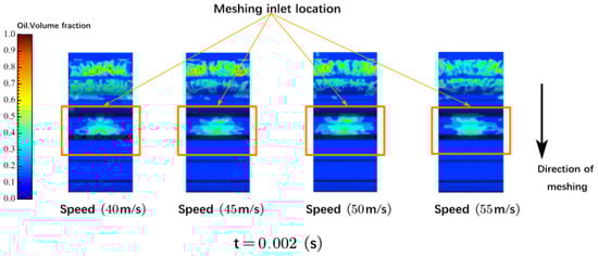 Distribution of gear-lubricating fluid under four different oil speed parameters (the orange region represents the meshing intake area).