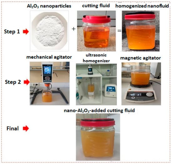 In this study, Oelheld DiaCut EMM 2500 vegetable-based cutting fluid, which is 100% biodegradable and has technical specifications that are listed in Table 3, was used because it does not leave any residue behind and is also suitable for worker health. The process of making the cutting fluid from vegetables for the nano-MQL method was carried out in 2 steps. In the first step, nano-Al2O3 nanoparticles, whose technical specifications, size, and chemical composition are given in Table 4, were added to the cutting fluid by weighing it with a precision balance at a rate of 0.5% by weight. In order to ensure homogeneous distribution of nano-Al2O3 nanoparticles added to the cutting fluid in the second step, the nano-Al2O3-reinforced cutting fluid for the nano-MQL technique was made by mixing it with a Heidolph Hei-Torque mechanical stirrer at 600 rpm for 30 min, a Bandelin SonoPuls HD3200 ultrasonic homogenizer at 100 W for 30 min, and a Heidolph MR Hei-Tec magnetic stirrer at 700 rpm for 30 min, respectively. The steps for the preparation of the nanofluid are shown in Figure 1.