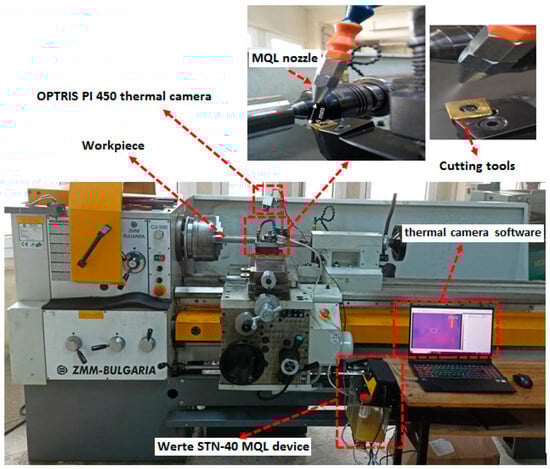 In machining methods, the traditional cutting fluid cooling/lubrication method is mainly used to reduce these elevated temperatures within the cutting area. However, the application of these cutting fluids has both advantages and disadvantages in the manufacturing process. Cutting fluids containing chemical components harm human health by coming into contact with workers’ skin in the production line and harms nature by mixing with the soil in cases where waste management is not conducted well [3]. In addition, there is an increase in operating costs due to the storage, disposal, and supply of these cutting fluids in relation to the total production cost [4,5]. Therefore, the increasing costs of cutting fluids, their environmental pollution, and their negative effects on human health have led to the development of new lubrication techniques such as the minimum quantity lubrication (MQL) system instead of traditional cutting fluid cooling/lubrication methods [6,7]. The MQL method is a lubricating and cooling technique where a tiny quantity of cutting fluid is misted onto the area being sliced where the workpiece and the tool interact with pressurized air’s assistance [8]. Thus, the application of a tiny quantity of cutting fluid in the MQL method has features that increase positive effects on operational efficiency and sustainable manufacturing, such as reducing operating costs compared to the conventional cooling/lubrication method, being harmless to human health, and eliminating the waste cost of end-of-life oils [9]. Today, many researchers obtain nanofluids by adding additives, also known as nanoparticles, to the MQL technique’s cutting fluid. Thanks to these nanofluids, the friction between the cutting tool and the workpiece can be significantly decreased, and lower cutting temperatures can be achieved by increasing the thermal conductivity of the cutting fluid. Thus, better cutting tool life and surface quality can be achieved with reduced cutting temperature and friction coefficient [10].