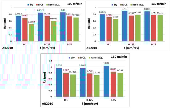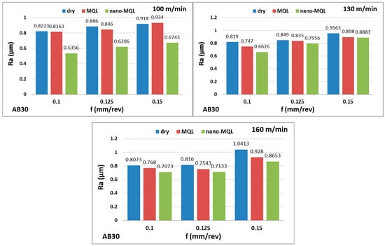 - For the cutting tool coded AB30, an average of 14% and a maximum of 34.39% improvement was achieved for Ra in the nano-MQL method compared to the MQL method, and an average of 18.42% and a maximum of 34.87% improvement was achieved compared to dry machining. The MQL method achieved an average of 4.82% and a maximum of 10.88% improvement in surface roughness compared to dry machining.