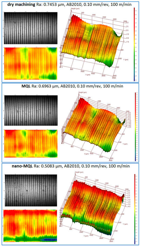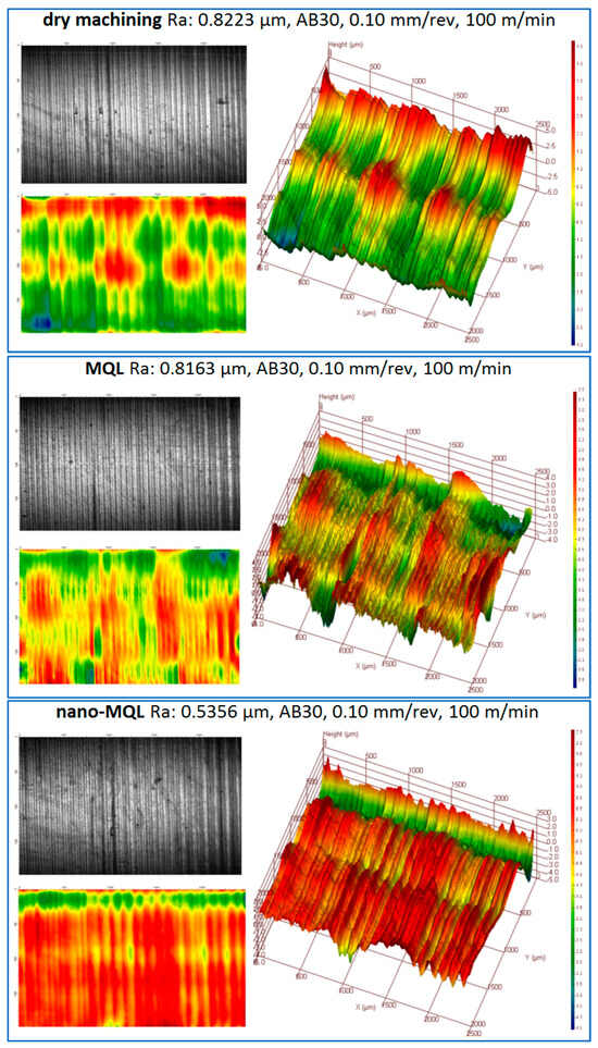 When a general evaluation is made for Ra, the best surface quality was obtained in the MQL method (nano-MQL) with 0.5% Al2O3 reinforcement, followed by the MQL and dry-cutting methods, respectively. When we examined the cutting tools, the finest surface quality was obtained with the AB2010-coded Al2O3 + TiC matrix-based PVD method and TiN-coated ceramic cutting tool. When we examined the feed value and cutting speed, the lowest Ra value was obtained at 0.10 mm/rev feed rate and 100 m/min cutting speed. In total, the optimum experimental parameters that give the finest surface quality, i.e., the lowest surface roughness values, were obtained when the nano-MQL cooling/lubrication method, AB2010-coded cutting tool, 0.10 mm/rev feed rate, and 100 m/min cutting speed are used together. In order to better understand the effect of the cooling/lubrication method on Ra values, surface topography was obtained for the experiments in which different cooling/lubrication methods were used to keep the cutting speed, feed rate, and cutting tool parameters constant. When the surface topographic data given in Figure 6 and Figure 7 were examined, it was seen that the peak and valley depths of the nano-MQL method were reduced in comparison to the MQL approach, and the MQL approach was reduced compared to the dry method.