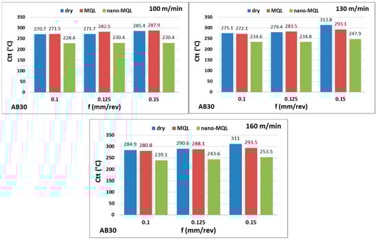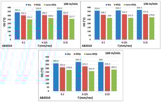 The cutting temperature values obtained due to hard machining are given in Figure 8 and Figure 9. Cutting temperature values for all parameters were between 251.2 °C and 384 °C. The smallest Ra value with the AB2010-coded TiN-coated ceramic cutting tool was measured as 251.2 °C using the nano-MQL cooling/lubrication method, 0.10 mm/rev feed rate, and 100 m/min cutting speed. When the graphs for the AB2010-coded cutting tool were examined, it was observed that when the cutting speed and cooling/lubrication method were kept constant, the cutting temperature values generally grew with the rising feed rate. This can be explained as an increase in the friction between the workpiece and the cutting tool with the increase in feed rate [24]. Therefore, in this study, the optimum feed rate for the AB2010-coded TiN coated ceramic cutting tool, in regard to low cutting temperature value, was found to be 0.10 mm/rev. Again, when the experimental graphs for the AB2010-coded cutting tool were examined, when the feed rate and cooling/lubrication method were kept constant, and an analysis was conducted on the cutting temperature values and varying cutting speeds, the cutting temperature values generally increased as the cutting speed increased. The reason for this was the increase in cutting temperature due to the increased friction at both the feed rate and the cutting speed [25,26]. In this study, the optimum cutting speed was 100 m/min in the experiments conducted with the AB2010-coded cutting tool.