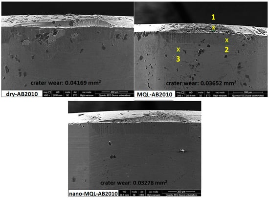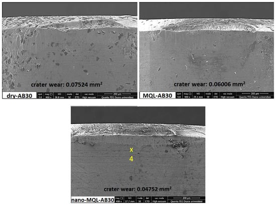 In light of the literature, it is thought that the crater wear that may occur on the cutting tool surfaces exposed to friction during cutting under MQL and nano-MQL conditions will occur at lower rates. It was found that the crater wear values given in the figure vary between 0.03278 mm2 and 0.07524 mm2. With the nano-MQL method, the AB2010 coated cutting tool produced the lowest crater wear value of 0.03278 mm2 after 15 min of machining. The lowest wear values for dry machining and MQL methods were calculated as 0.04169 mm2 and 0.03652 mm2, respectively. When the cutting tools were compared with each other, at the end of 15 min of machining time, the Al2O3 + TiC matrix-based and TiN-coated ceramic tool (AB2010) with PVD method provided 50% lower crater wear than the Al2O3+TiC matrix-based uncoated mixed alumina ceramic (AB30) tool. This result was associated with the TiN coating on the top layer of this cutting tool providing a low friction coefficient and good crater wear resistance despite not being a very hard material [33,34]. In general, tool life is not limited by minor crater wear. In fact, crater development makes the tool rake angle more effective, which lowers surface roughness. The cutting edge is weakened by excessive crater wear, though, and the tool may break or deform [34,35]. As a result, it degrades the quality of the machined surface, leading to wear types on the cutting tool’s surface and edge areas, including flank wear and crater wear [36,37].
