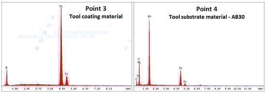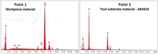 Figure 12 shows the EDX analysis results obtained from the cutting tools. Since the adhesion size was at the micro level, it may be said that the cooling/lubrication technique used helps avoid adhesion. In addition, the rough appearance of the worn areas in Figure 10 and Figure 11 shows that abrasive and adhesive wear mechanisms were effective [38,39]. Tool particles were created and transported with the material flow as the workpiece material cycles between sticking and sliding on the cutting tool. The movement between the cutting tool and the chip, the operative cutting process, irregular depth of cut, and the vibration produce an irregular material flow that will trigger wear [40,41]. It is believed that severe mechanical loads also caused the coating material to peel, as seen on the rake face of the cutting inserts (Figure 10 and Figure 11). Figure 10 and Figure 11 show that there was a small amount of adhered workpiece material in the cutting tool zones, indicating that the cooling/lubrication methods applied with Al2O3 nanoparticle-added nanofluid-MQL are appropriate for hard turning of hot work tool steel alloyed with Cr, Ni, and Mo with ceramic cutting tools.