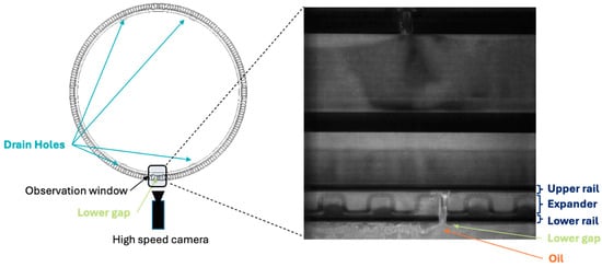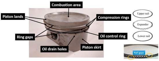 The oil control ring shown in Figure 1 consists of three components, the upper rail, expander, and lower rail. Each ring has a gap for ease of installation, and these gaps serve as critical paths for oil transport. The upper and lower rails create a barrier to regulate the oil flow, while the expander functions as a spring, providing tension force to the rails to seal the ring/liner interface. The function of the top ring is to control high pressure gas entering the ring pack. The oil control rings regulate the oil supply to the top two rings and control the oil film thickness on the liner [1,2,3,4]. The second ring acts as a buffer, providing secondary control for both oil and gas. In addition to controlling the upward oil flow, the oil control ring is a favorable path for the release of the oil after performing the lubrication function in the upper regions. The release function of the oil control ring is largely accomplished through the drain holes inside the oil control ring groove [5,6,7].
