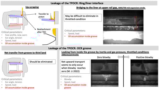 These processes, illustrated in Figure 2, demonstrate that the amount of oil leakage is heavily dependent on the oil accumulation inside the groove. Therefore, developing a model to estimate the oil accumulation in the groove is crucial. However, the understanding of oil accumulation in the oil control ring groove is still very limited. Previous studies on TPOCR oil transport and its effect on LOC showed that the level of LOC increases during the transition from low to high load conditions [10,11]. Operating under the blow-by separation line (low load) conditions leads to high LOC, with oil accumulation in the TPOCR groove tending to be higher at low loads and low engine speeds [9].