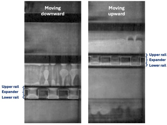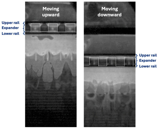 Figure 4 and Figure 5 illustrate the behavior of oil transport during the transition between the piston’s downward and upward movements, and vice versa. As the piston reaches the bottom dead center (BDC), driven by the downward inertial force, the oil in the pitch with higher thickness hits the lower rail, forming a puddle. When the piston starts its upward motion, with the downward inertial force, the oil in the expander spreads out to neighboring units and forms a flattened film, as illustrated in Figure 4. Conversely, at the top dead center (TDC), the oil similarly hits the upper rail, forming a puddle, and upon the downward motion, the oil redistributes between the adjacent pitches and forms a flattened film, as depicted in Figure 5. An additional note is that the oil bridging from the piston to the liner occurs when the piston moves toward the BDC and the TDC. In the areas with bridged oil, the trailing rail becomes fully flooded and, thus, increases the oil leakage through the rail/liner interface locally. The higher the oil accumulation inside the TPOCR groove is, the earlier the bridging occurs with a longer duration. Increasing the upper rail leakage from the liner, caused by higher oil accumulation through oil bridging, is one of the main reasons to increase the understanding of the oil accumulation inside the TPOCR groove. There are two driving forces for the redistribution and accumulation pattern inside the oil ring groove, namely inertia and bridging. The observations shown in Figure 4 and Figure 5 are the combined results of the two forces mentioned above. Figure 6 is an illustration showing the effects separately. Currently, there is no numerical study of this distribution process within the groove. Therefore, developing a numerical study and a predictive model for oil distribution in the oil control ring groove is essential for advancing our understanding and improving the overall design. This work is focused on the inertia effect, which is always present, in contrast to the gas flow effect, which is only effective locally and during certain periods of a cycle.