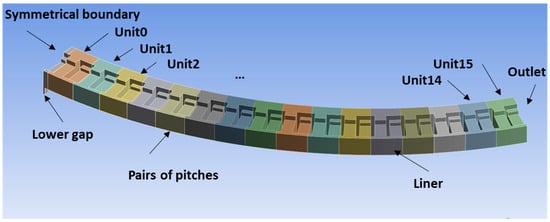 In these CFD simulations, the clearance between the oil control ring rail/land and the liner was ignored due to its negligible size compared to other dimensions, as it was not the primary focus of this study. To optimize computational efficiency, the model was simplified to include only a segment consisting of 16 pairs of pitches. This reduction was considered sufficient for analyzing the slow oil transport process along the groove.
