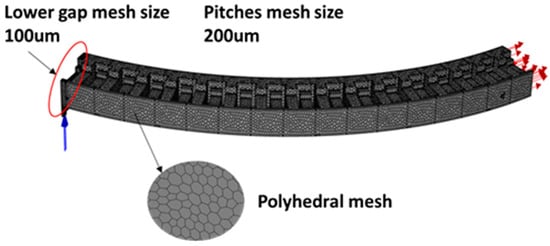 The mesh for the CFD simulations, depicted in Figure 8, was generated using Ansys Meshing. A polyhedral mesh was chosen for its superior accuracy in representing complex geometries, offering better resolution of geometric features, and conforming well to the simulated object. The mesh size was set to 100 µm around the gap and 200 µm away from the gap.