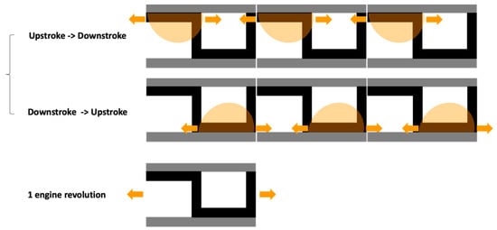 While there used to be many different types of expanders, the ES-80 type expander has gradually become the most popular type. As shown in Figure 1 and referenced in the SAE piston ring-grooves standard [20], the expander exhibits an alternating pattern along its circumference. A pitch with the horizontal bar on the top is followed by one on the bottom. Due to the space occupied by the horizontal bar, oil accumulation between the two adjacent pitches differs. Consequently, when the inertia shifts direction, the pitch with a higher accumulation experiences earlier oil movement. This movement, driven by inertia, varies between pitches. For this reason, we divided the expander into units with each unit composed of two pitches, as illustrated in Figure 9. During the transition from upstrokes to downstrokes, oil in the left pitch with an expander exceeds that in the right pitch without an expander. As the inertial force shifts upward, oil from the lower rail begins to move to the upper rail. Once the oil puddle reaches the upper rail, it disperses laterally from the left pitch to the right pitch, eventually reaching equilibrium. At equilibrium, the right pitch holds more oil than the left pitch. Conversely, when the inertial force shifts downward, the oil flows from right pitch back to the left pitch. By considering these upward and downward forces together, the oil flows both upstream and downstream, as illustrated in Figure 10. The outflow rate from each unit is a function of the oil volume it contains, the engine speed, the oil density, and the oil viscosity. This relationship can be expressed as follows: