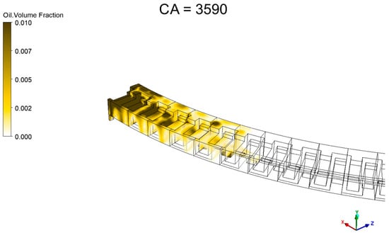The oil flow rate through the boundary and the oil mass in each unit were calculated from CFD simulations. The simulation result at crank angle 3590° is shown in Figure 11. The yellow regions represent the oil volume fractions.