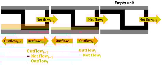To extract the outflow through the boundary from the net flow, the first empty unit () in the groove must be identified. Since there was no outflow from to , the outflow of to could be calculated by the oil volume change in . The outflow of could then be obtained by subtracting the net flow of from the outflow of . This procedure was applied iteratively to obtain the outflow for all other units. An illustration of this process is shown in Figure 12. By compiling all the data, the coefficients a, b, c, and d in Equation 1 could be obtained.