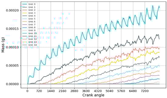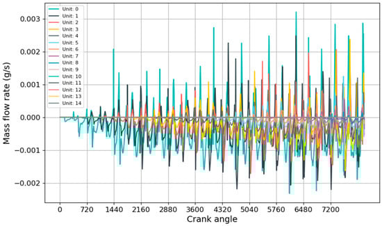 To determine the average effect of oil transport within one engine revolution, the oil flow rate and oil volume were averaged over each revolution. However, after performing the averaging, the flow rate across the boundary between units represented the net flow. To correlate the outflow and oil volume, further data processing was required.