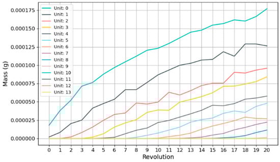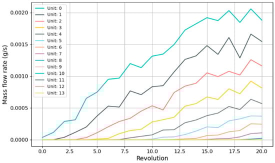 To validate the oil distribution model and ensure accuracy in predicting oil distribution within the groove, the model was compared against CFD results through simulations replicating CFD settings. A model comprising 14 units was constructed for this purpose, excluding units 0 and 1 as they are adjacent to the lower gap and do not represent typical oil transport behavior in the groove. The boundary conditions of this simplified model used the mass flow rate of unit 1 derived from CFD results. The simulations covered 20 revolutions to be compared with the CFD results.