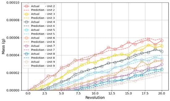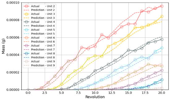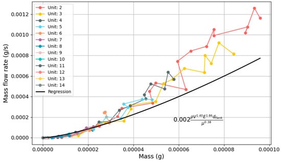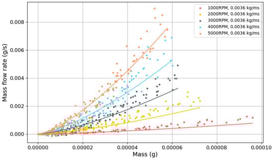 Figure 15 and Figure 16 present the oil volume and outflow rate after data processing, showing clearer trends. It can be clearly seen that both the oil volume and oil outflow rate gradually increase, although the rate of growth slows over time. Figure 17 shows the correlation between the oil accumulation and mass flow rate through the boundary. Each line depicts the change in oil accumulation and mass flow rate for each unit over time. The dots represent the amount of oil and flow rates for each revolution. The dots near the lower left correspond to the initial stages of oil accumulation, while those toward the upper right reflect data after more engine revolutions. The proposed equation effectively reflects the behavior observed in the CFD results. The derived regression equation is as follows: