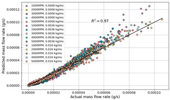 The relationship between engine the speed and flow rate is also nonlinear and has a more pronounced impact than oil volume. The correlation for different engine speeds is shown in Figure 18. Oil transport is more stable at lower engine speeds, as indicated by the dots aligning well with the regression results. In contrast, at higher engine speeds, the dots spread more widely, indicating greater instability. Nevertheless, the proposed method can still effectively capture these trends.