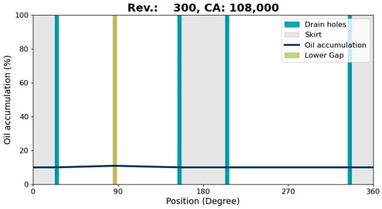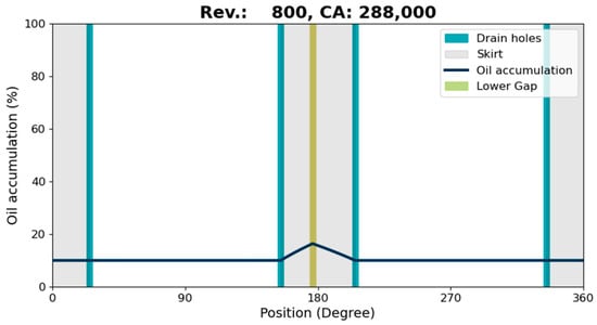 The primary objective of this model is to predict oil distribution over several thousand engine revolutions, a task unfeasible with CFD due to computational limitations. Consequently, CFD cannot be used to verify the oil distribution model developed here for long-term predictions; instead, experimental results must be used for validation. To compare with experimental results, a model replicating the experimental setup was developed. The oil control ring used in the experiment comprised 101 units with four drain holes on the piston. Observations during the experiments indicated that the oil control ring could rotate along the circumferential direction, and in this study, the rotation speed was approximately 2000 revolutions for the ring to complete one full rotation [9]. This rotational effect, which significantly impacts oil distribution in the groove, was incorporated into the model. The oil density was 800 and the viscosity was 0.016 . The oil inflow through the lower gap was assumed to be a 20 µm oil film on the skirt, representing a typical thickness for demonstration purposes in the model. Oil entered the groove through the lower gap primarily when it was within the skirt regions, and only a 1 µm oil film was considered on the liner when the lower gap was outside these regions. Parametric studies were conducted and are provided in the next section to explore the dependency of the oil accumulation on the thickness of the oil film passing by the piston skirt.