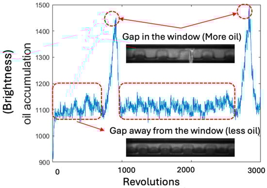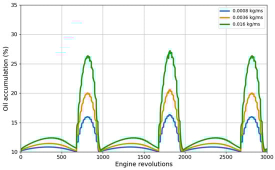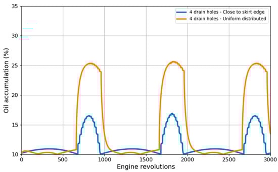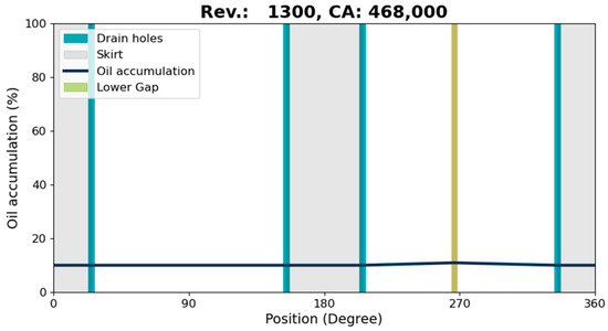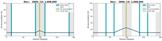 where is the oil inflow rate, h is the oil film thickness, is the gap width (0.377 mm), is the stroke length (88 mm), and E represents engine speed (2000 RPM). This study considers four drain holes, with the arrangement as shown in Figure 22. The results reveal that a thicker oil film on the liner allows more oil to flow into the groove, leading to greater oil accumulation. The highest oil accumulation occurred between revolutions 750 to 1000, 1750 to 2000, and 2750 to 3000, corresponding to when the lower gap enters the skirt region. Figure 28 presents these results.