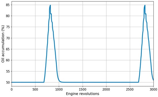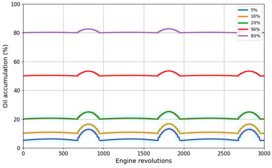 Figure 22, Figure 23 and Figure 24 illustrate the oil distribution in the oil control ring groove at different stages. The x-axis represents the piston’s position, while the y-axis indicates oil accumulation in the groove, quantified as the ratio of empty space filled with oil.