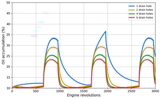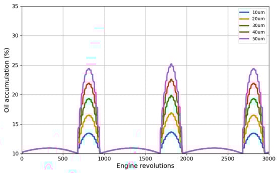The oil distribution model was applied to simulate various scenarios, including the oil film thickness, the engine speed, the oil viscosity, and the number and arrangement of drain holes. The maximum oil accumulation in the groove was used as the metric for analyzing oil accumulation, as it directly influences the extent of oil leakage through the oil control ring.