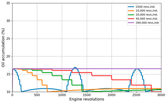 In this section, various ring rotation speeds were tested to evaluate their effect on oil accumulation. The ring rotation speed is defined as the number of engine revolutions required for the oil control ring to complete one full rotation. Five different rotation speeds were considered, ranging from 2500 revolutions/rotations to 30,000 revolutions/rotations. Since the simulation involved 3000 engine revolutions, the case of 30,000 revolutions/rotation represents a stationary ring. As shown in Figure 35, the oil accumulation remains at a constant level in this scenario, where the inflow and outflow are balanced. In contrast, when the ring rotation speed is set to 2500 revolutions/rotation, two and a half peaks were observed. This is because, in this case, the lower gap starts from the position at 180 degrees, and as the ring completes one rotation, the lower gap enters the skirt region twice, resulting in higher oil accumulation.