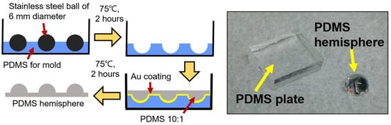 Next, the PDMS hemisphere was fabricated following the procedure outlined below. Figure 1 (left) shows a schematic diagram of the PDMS hemisphere fabrication process. In the first step, a hemisphere mold made of PDMS was fabricated to create a PDMS hemisphere with a diameter of 6 mm for use in a pin-on-disk friction tester. A 6 mm diameter stainless steel ball was placed on a PDMS mixture, prepared at a mass ratio of 10:1, and heated in a dry oven at 75 °C for 2 h. After heating, the steel ball was removed to complete the hemisphere mold. The finished mold was then coated with a 50 nm layer of gold, which served as an anti-sticking layer for demolding the PDMS hemisphere. The PDMS mixture, prepared at a mass ratio of 10:1, was poured into the gold-coated hemisphere mold and heated at 75 °C for 2 h. After heating, the PDMS hemisphere was removed from the mold. Figure 1 (right) shows an image of the completed PDMS plate and hemisphere, created following the procedure outlined above.