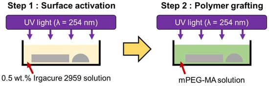 To modify the surface properties of PDMS, a technique involving the application of another polymer with the desired characteristics is used. Methods for coating one polymer onto the surface of another include using covalent bonding reactions or employing electrostatic self-assembly in a layer-by-layer approach [,,]. In the case of polymer coatings formed layer by layer through electrostatic self-assembly, ultraviolet (UV) light is used to induce covalent bonds between the polymers, thereby enhancing the stability of the coating [,,,]. One method to induce covalent bond reactions on polymer surfaces, thereby combining polymers with different properties, is polymer grafting [,,,]. Polymer grafting involves the creation of radicals on the surface of a polymer to facilitate the coating with a desired polymer. Techniques such as plasma treatment, ozone treatment, and UV irradiation are used to activate these radicals [,]. In the case of UV irradiation methods, radicals are generated on the polymer surface through a chemical reaction involving a photoinitiator [,,]. Polymer grafting can be categorized into two main types: ‘grafting-from’ and ‘grafting-to’. The process of reacting radicals generated on the polymer surface with a monomer that possesses the desired properties is referred to as the ‘grafting-from’ method. Conversely, the technique of coating by reacting these radicals with functional end groups is known as the ‘grafting-to’ method [,]. When hydrophilicity is required on polymer surfaces, poly(ethylene glycol) (PEG) can be utilized through grafting techniques. PEG has excellent biocompatibility due to its low toxicity, flexibility, and hydrophilic properties. In addition, PEG has the property of preventing opsonization, which allows polymers with low biocompatibility to continue to function in a biological environment through PEG grafting [,,,,]. Based on these properties, PEG is suitable for biomedical research, chemical analysis, cosmetics, and lubrication in moist environments. In PEG grafting, the molecular weight of PEG can be adjusted to control the properties of the resulting polymer. Low molecular weight PEG exhibits uniformity and smoothness, with film thickness equal to the molecular length [].