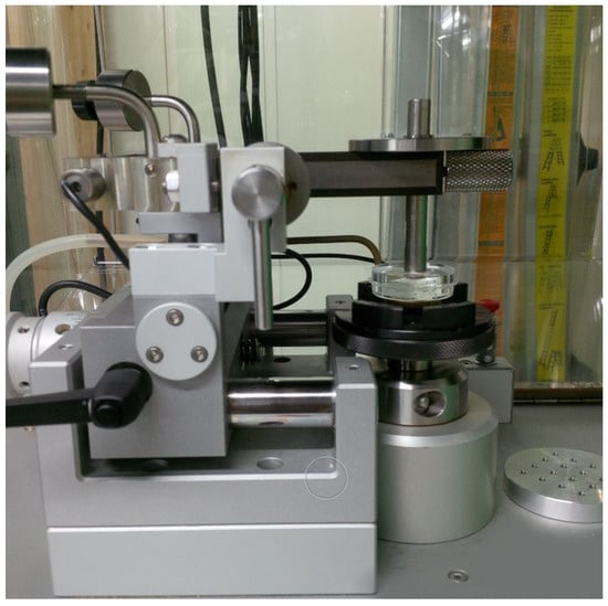 In this work, PDMS was selected as the material for the water-lubricated friction test. PDMS specimens of appropriate size for a pin-on-disk friction tester along with PDMS hemispheres to serve as counter surfaces, were manufactured. First, the following procedure was followed to produce a flat PDMS plate. The PDMS prepolymer (Sylgard 184, Dow Corning, Midland, MI, USA) was mixed at its curing agent at a weight ratio of 10:1. After removing the bubbles from the mixture, the PDMS was poured into a petri dish and heated in a dry oven at 75 °C for 2 h. The thickness of the finished PDMS specimen was adjusted to 4–5 mm.