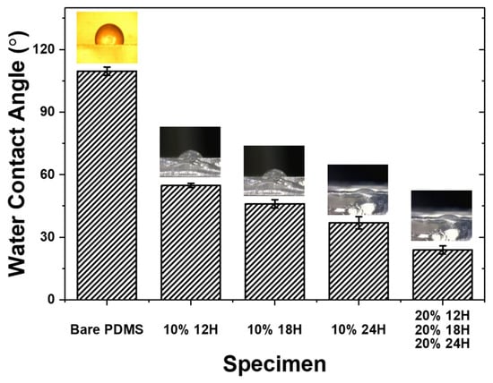 To evaluate the hydrophilicity of the PDMS surface grafted with mPEG-MA, the water contact angle was measured. Figure 4 shows the results of the water contact angle measurements for bare PDMS, 10% 12H, 10% 18H, 10% 24H, 20% 12H, 20% 18H, and 20% 24H specimens. The contact angles were measured as follows: 109.6 degrees for bare PDMS, 54.8 degrees for 10% 12H, 46 degrees for 10% 18H, 36.9 degrees for 10% 24H, and 24 degrees for 20% 12H, 20% 18H and 20% 24H. Generally, a water contact angle of less than 90 degrees is classified as hydrophilic [,]. Therefore, it was confirmed that the PDMS surface became hydrophilic through the grafting of mPEG-MA. Additionally, the results showed that the water contact angle decreased as the concentration of the mPEG-MA aqueous solution and the UV irradiation time increased. This indicates that hydrophilicity improved with stronger mPEG-MA grafting conditions.