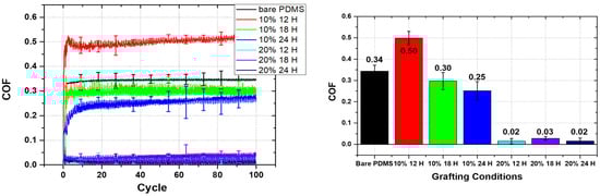 COF of bare PDMS and PDMS grafted with mPEG-MA performed at 1 N and 1 mm/s under water lubrication (left), and average COF of each specimens (right).