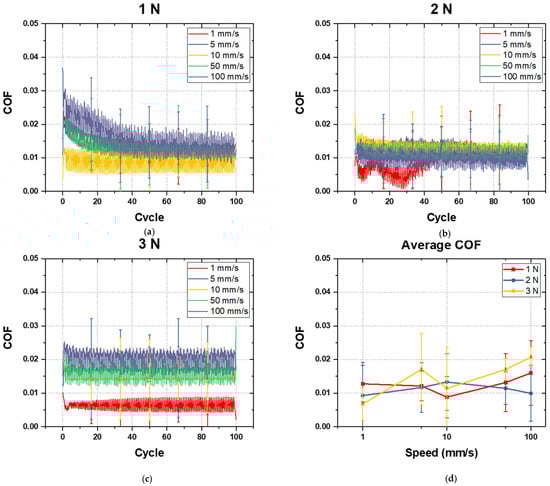 COF of 20% 12H specimen performed under water lubrication (a) at 1 N and 1~100 mm/s, (b) at 2 N and 1~100 mm/s, (c) at 3 N and 1~100 mm/s, and (d) average COF with respect to normal load and sliding speed.